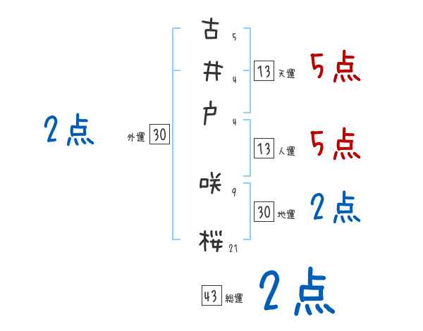 総運![]() | 古井戸咲桜さんの総運は43画の2つ星!頑固な性格で独立心が強いかも。やや非現実的で浪費に注意しましょう。 あなたの人生を表す1番重要な運勢です。生涯を通じて影響する総合運となり、主に50歳以降の晩年期に影響を及ぼします。 |