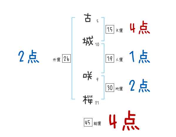 天運![]() | 古城咲桜さんの天運は15画の4つ星!人徳があり出世する。順調に物事を進め円満な人生。 家系が持つ宿命的な運勢を表します。祖先から受け継いだ苗字ですので自分の力が及びません。家柄を象徴します。 |