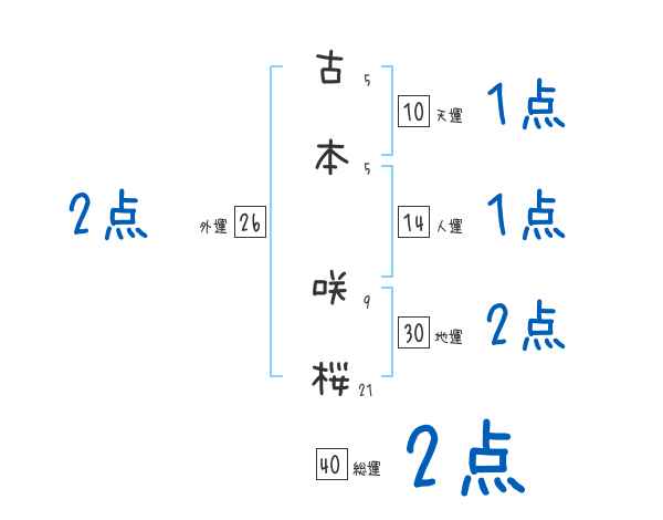天運![]() | 古本咲桜さんの天運は10画の1つ星!不安を感じやすい傾向。ストレスを抱えないように注意しましょう。 家系が持つ宿命的な運勢を表します。祖先から受け継いだ苗字ですので自分の力が及びません。家柄を象徴します。 |