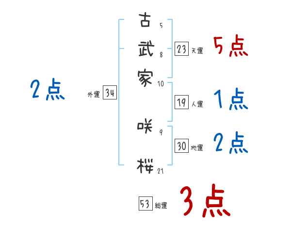 総運![]() | 古武家咲桜さんの総運は53画の3つ星!やや見栄っ張りで虚栄心がある。散財に注意。 あなたの人生を表す1番重要な運勢です。生涯を通じて影響する総合運となり、主に50歳以降の晩年期に影響を及ぼします。 |