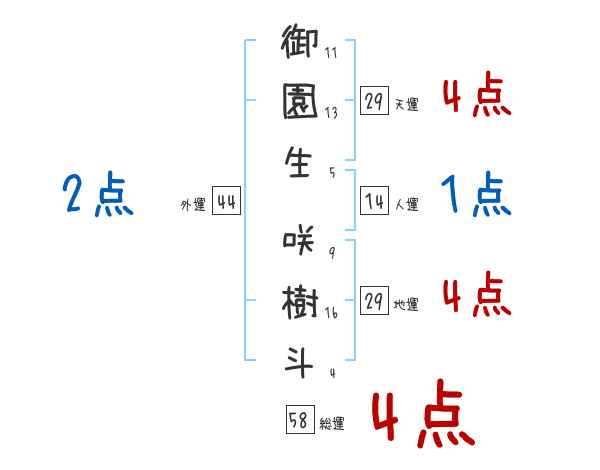 総運![]() | 御園生咲樹斗さんの総運は58画の4つ星!安定した生活。大器晩成タイプ。 あなたの人生を表す1番重要な運勢です。生涯を通じて影響する総合運となり、主に50歳以降の晩年期に影響を及ぼします。 |