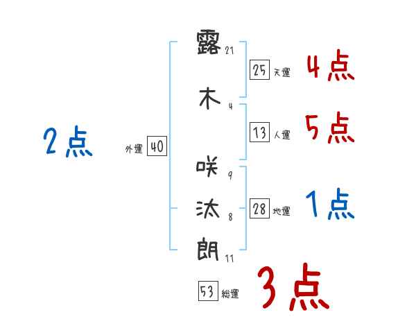 総運![]() | 露木咲汰朗さんの総運は53画の3つ星!やや見栄っ張りで虚栄心がある。散財に注意。 あなたの人生を表す1番重要な運勢です。生涯を通じて影響する総合運となり、主に50歳以降の晩年期に影響を及ぼします。 |