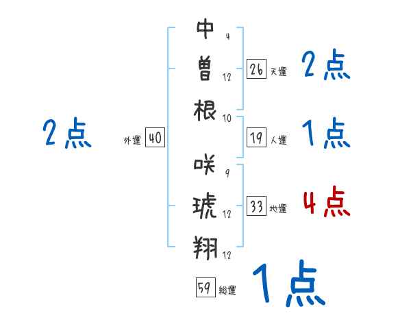 天運![]() | 中曽根咲琥翔さんの天運は26画の2つ星!波瀾万丈かも。信頼できる人を大事にしましょう。 家系が持つ宿命的な運勢を表します。祖先から受け継いだ苗字ですので自分の力が及びません。家柄を象徴します。 |