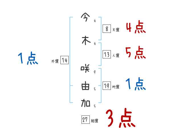 外運![]() | 今木咲由加さんの外運は14画の1つ星!人に対して優しいがストレスを溜め込みがち。人間関係のトラブルを避けるよう気をつけましょう。 生活面を象徴する運勢です。外部から受ける影響力を表し、結婚運、家庭運や職場、環境への順応性を表します。 |