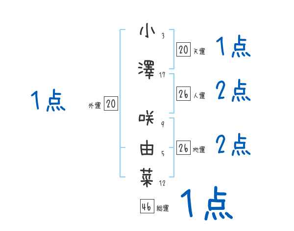 総運![]() | 小澤咲由菜さんの総運は46画の1つ星!迷走することが多く苦労するかも。目先のことにとらわれないように。 あなたの人生を表す1番重要な運勢です。生涯を通じて影響する総合運となり、主に50歳以降の晩年期に影響を及ぼします。 |