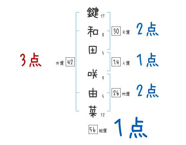 総運![]() | 鍵和田咲由菜さんの総運は56画の1つ星!消極的で無気力になりがち。誠実な気持ちが必要でしょう。 あなたの人生を表す1番重要な運勢です。生涯を通じて影響する総合運となり、主に50歳以降の晩年期に影響を及ぼします。 |