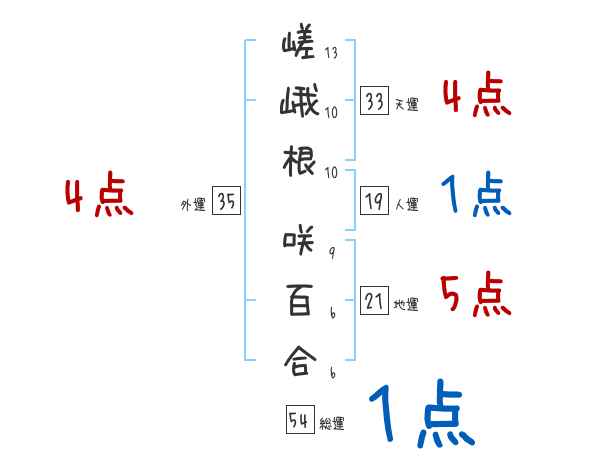 人運![]() | 嵯峨根咲百合さんの人運は19画の1つ星!優れた才能を持ちますが、協調性が足りないことも。周りの人と協力する事を意識しましょう。 性格や才能などを表す2番目に重要な運勢です。人間関係や協調性、社会的な成功に影響します。主に20歳から50歳ぐらいまでの中年期の運勢を表します。 |