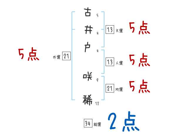 天運![]() | 古井戸咲稀さんの天運は13画の5つ星!才能に恵まれ人気がある。名声を手に入れる。円満な人生。 家系が持つ宿命的な運勢を表します。祖先から受け継いだ苗字ですので自分の力が及びません。家柄を象徴します。 |
