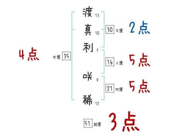 人運![]() | 渡真利咲稀さんの人運は16画の5つ星!人望が厚く大きく発展する。逆転成功が見える。 性格や才能などを表す2番目に重要な運勢です。人間関係や協調性、社会的な成功に影響します。主に20歳から50歳ぐらいまでの中年期の運勢を表します。 |
