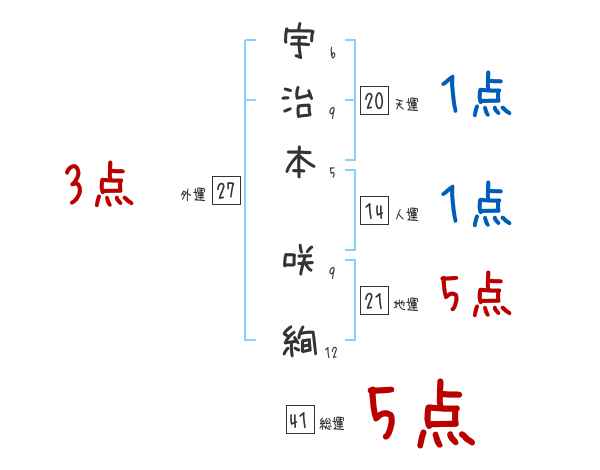 外運![]() | 宇治本咲絢さんの外運は27画の3つ星!頭脳明晰だが強情で摩擦が多い傾向。孤立に注意。 生活面を象徴する運勢です。外部から受ける影響力を表し、結婚運、家庭運や職場、環境への順応性を表します。 |