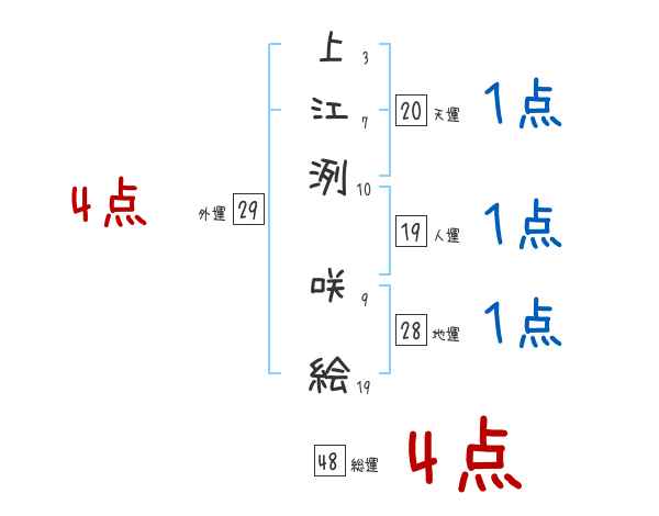 外運![]() | 上江洌咲絵さんの外運は29画の4つ星!完全主義で才能がある。厳格な心の持ち主。 生活面を象徴する運勢です。外部から受ける影響力を表し、結婚運、家庭運や職場、環境への順応性を表します。 |