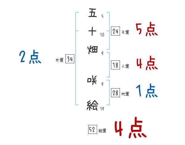 人運![]() | 五十畑咲絵さんの人運は18画の4つ星!情熱的で剛気。忍耐力があり信頼される。 性格や才能などを表す2番目に重要な運勢です。人間関係や協調性、社会的な成功に影響します。主に20歳から50歳ぐらいまでの中年期の運勢を表します。 |