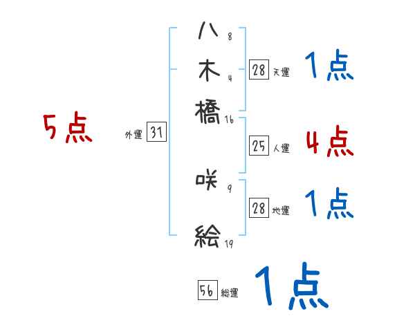 天運![]() | 八木橋咲絵さんの天運は28画の1つ星!家庭環境に注意。スポーツで活躍できる能力があるかも。 家系が持つ宿命的な運勢を表します。祖先から受け継いだ苗字ですので自分の力が及びません。家柄を象徴します。 |