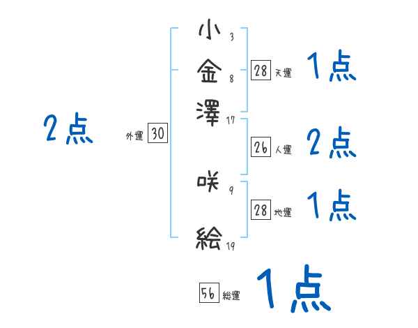 天運![]() | 小金澤咲絵さんの天運は28画の1つ星!家庭環境に注意。スポーツで活躍できる能力があるかも。 家系が持つ宿命的な運勢を表します。祖先から受け継いだ苗字ですので自分の力が及びません。家柄を象徴します。 |