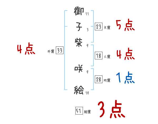 天運![]() | 御子柴咲絵さんの天運は23画の5つ星!想像力に優れ活力がある。一代で成功し名誉を手に入れる。 家系が持つ宿命的な運勢を表します。祖先から受け継いだ苗字ですので自分の力が及びません。家柄を象徴します。 |
