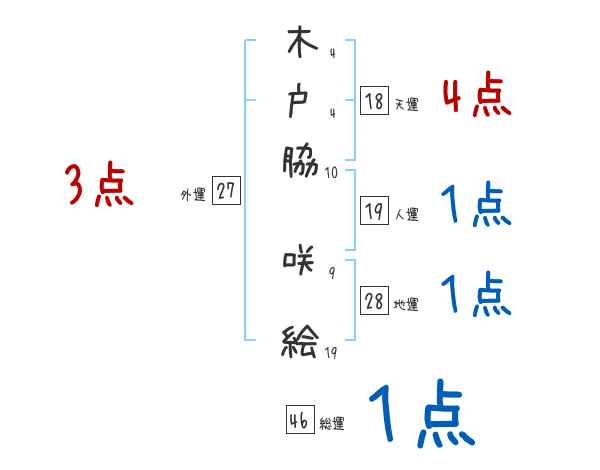 天運![]() | 木戸脇咲絵さんの天運は18画の4つ星!情熱的で剛気。忍耐力があり信頼される。 家系が持つ宿命的な運勢を表します。祖先から受け継いだ苗字ですので自分の力が及びません。家柄を象徴します。 |
