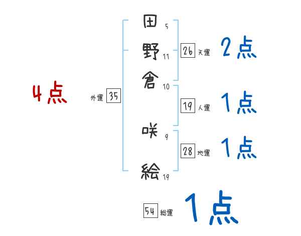 外運![]() | 田野倉咲絵さんの外運は35画の4つ星!温厚な性格で感受性が高い。穏和な性格で人望が厚い。 生活面を象徴する運勢です。外部から受ける影響力を表し、結婚運、家庭運や職場、環境への順応性を表します。 |