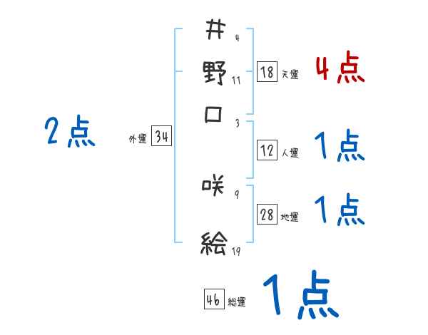 総運![]() | 井野口咲絵さんの総運は46画の1つ星!迷走することが多く苦労するかも。目先のことにとらわれないように。 あなたの人生を表す1番重要な運勢です。生涯を通じて影響する総合運となり、主に50歳以降の晩年期に影響を及ぼします。 |