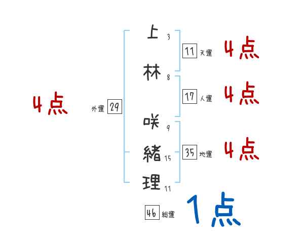 総運![]() | 上林咲緒理さんの総運は46画の1つ星!迷走することが多く苦労するかも。目先のことにとらわれないように。 あなたの人生を表す1番重要な運勢です。生涯を通じて影響する総合運となり、主に50歳以降の晩年期に影響を及ぼします。 |