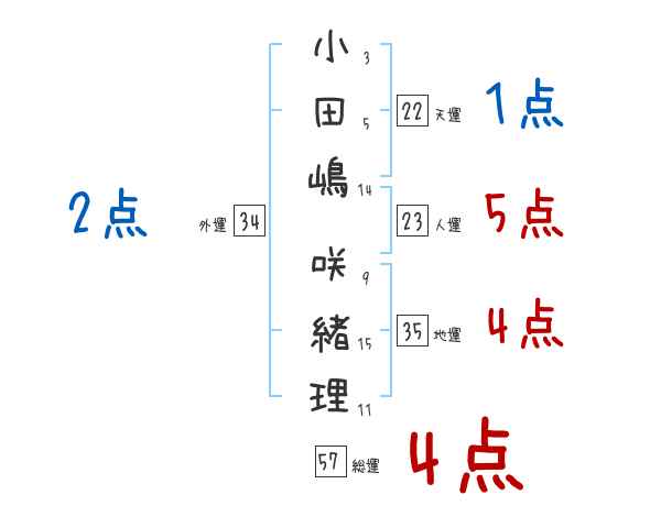 人運![]() | 小田嶋咲緒理さんの人運は23画の5つ星!想像力に優れ活力がある。一代で成功し名誉を手に入れる。 性格や才能などを表す2番目に重要な運勢です。人間関係や協調性、社会的な成功に影響します。主に20歳から50歳ぐらいまでの中年期の運勢を表します。 |