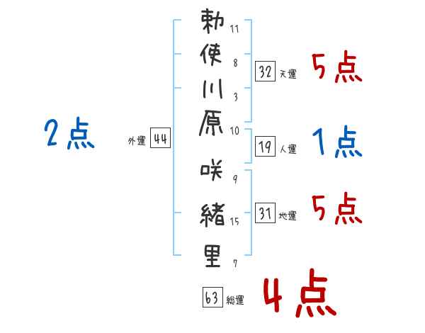 天運![]() | 勅使川原咲緒里さんの天運は32画の5つ星!柔軟性があり成功する。チャンスが多く金運が良い。 家系が持つ宿命的な運勢を表します。祖先から受け継いだ苗字ですので自分の力が及びません。家柄を象徴します。 |