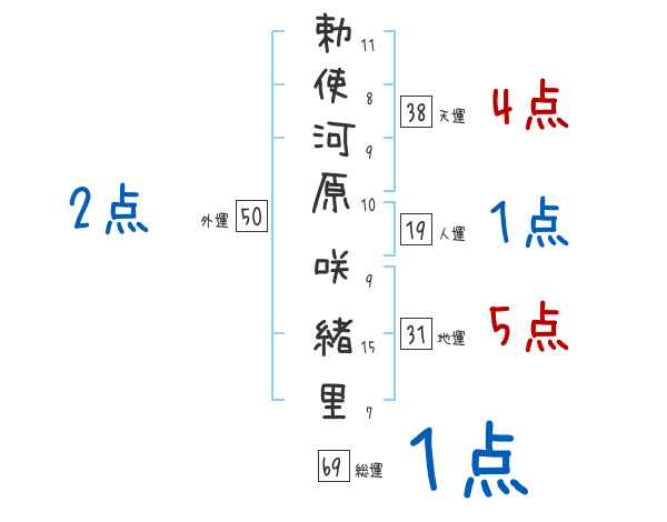 外運![]() | 勅使河原咲緒里さんの外運は50画の2つ星!浮き沈みが激しく不安定。しりすぼみに衰退しやすいので注意しましょう。 生活面を象徴する運勢です。外部から受ける影響力を表し、結婚運、家庭運や職場、環境への順応性を表します。 |