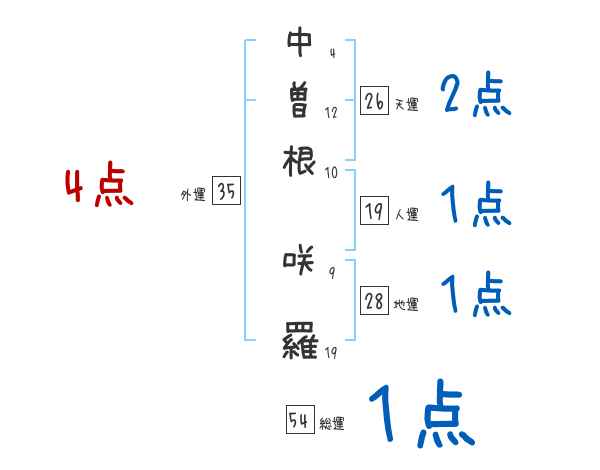 天運![]() | 中曽根咲羅さんの天運は26画の2つ星!波瀾万丈かも。信頼できる人を大事にしましょう。 家系が持つ宿命的な運勢を表します。祖先から受け継いだ苗字ですので自分の力が及びません。家柄を象徴します。 |