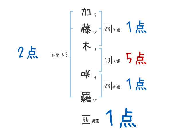 天運![]() | 加藤木咲羅さんの天運は28画の1つ星!家庭環境に注意。スポーツで活躍できる能力があるかも。 家系が持つ宿命的な運勢を表します。祖先から受け継いだ苗字ですので自分の力が及びません。家柄を象徴します。 |