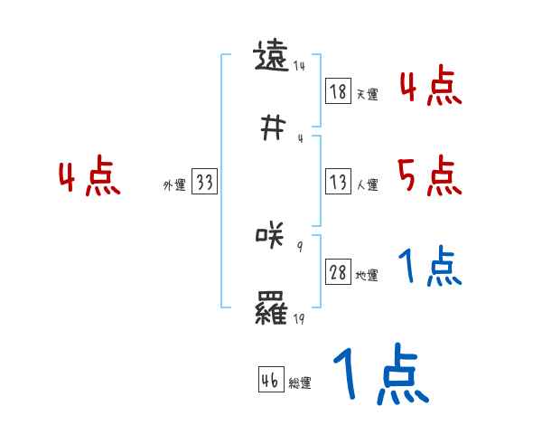 外運![]() | 遠井咲羅さんの外運は33画の4つ星!権力志向でプライドが高い。勇気があり運を切り開き成功する。 生活面を象徴する運勢です。外部から受ける影響力を表し、結婚運、家庭運や職場、環境への順応性を表します。 |