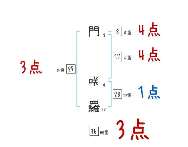 地運![]() | 門咲羅さんの地運は28画の1つ星!家庭環境に注意。スポーツで活躍できる能力があるかも。 個性を表す基礎的な運勢です。性格形成や対人関係、行動力など家庭環境に影響されます。主に誕生してから20歳くらいまでの若年期の運勢を表します。 |