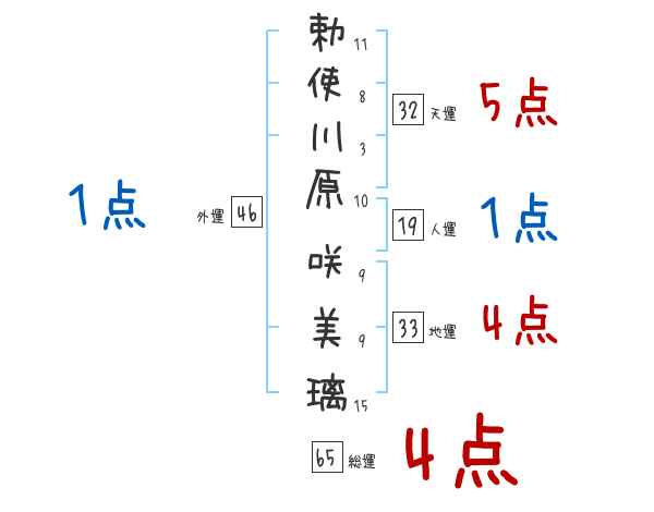 天運![]() | 勅使川原咲美璃さんの天運は32画の5つ星!柔軟性があり成功する。チャンスが多く金運が良い。 家系が持つ宿命的な運勢を表します。祖先から受け継いだ苗字ですので自分の力が及びません。家柄を象徴します。 |