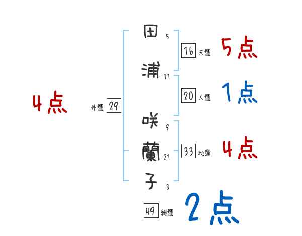 外運![]() | 田浦咲蘭子さんの外運は29画の4つ星!完全主義で才能がある。厳格な心の持ち主。 生活面を象徴する運勢です。外部から受ける影響力を表し、結婚運、家庭運や職場、環境への順応性を表します。 |