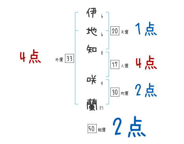 外運![]() | 伊地知咲蘭さんの外運は33画の4つ星!権力志向でプライドが高い。勇気があり運を切り開き成功する。 生活面を象徴する運勢です。外部から受ける影響力を表し、結婚運、家庭運や職場、環境への順応性を表します。 |