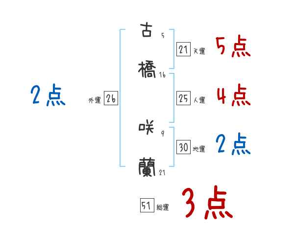 天運![]() | 古橋咲蘭さんの天運は21画の5つ星!統率力がある。独立し成功する。名誉を手に入れる。 家系が持つ宿命的な運勢を表します。祖先から受け継いだ苗字ですので自分の力が及びません。家柄を象徴します。 |