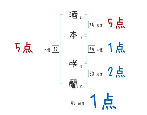 外運![]() | 酒本咲蘭さんの外運は32画の5つ星!柔軟性があり成功する。チャンスが多く金運が良い。 生活面を象徴する運勢です。外部から受ける影響力を表し、結婚運、家庭運や職場、環境への順応性を表します。 |