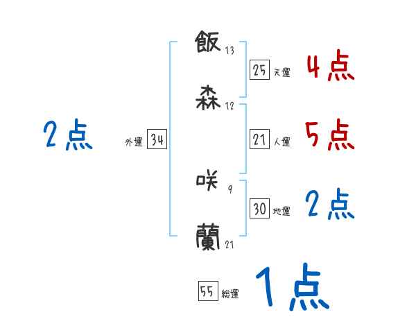 人運![]() | 飯森咲蘭さんの人運は21画の5つ星!統率力がある。独立し成功する。名誉を手に入れる。 性格や才能などを表す2番目に重要な運勢です。人間関係や協調性、社会的な成功に影響します。主に20歳から50歳ぐらいまでの中年期の運勢を表します。 |