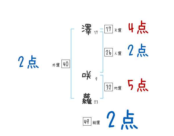 人運![]() | 澤咲蘿さんの人運は26画の2つ星!波瀾万丈かも。信頼できる人を大事にしましょう。 性格や才能などを表す2番目に重要な運勢です。人間関係や協調性、社会的な成功に影響します。主に20歳から50歳ぐらいまでの中年期の運勢を表します。 |