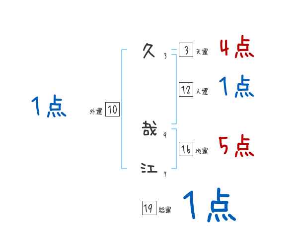 天運![]() | 久哉江さんの天運は3画の4つ星!活動的で才能に恵まれ、多くの信頼を得る。希望に満ち成長する。 家系が持つ宿命的な運勢を表します。祖先から受け継いだ苗字ですので自分の力が及びません。家柄を象徴します。 |