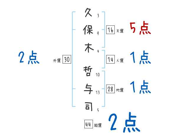 外運![]() | 久保木哲与司さんの外運は30画の2つ星!浮き沈みの激しさに注意しましょう。 生活面を象徴する運勢です。外部から受ける影響力を表し、結婚運、家庭運や職場、環境への順応性を表します。 |
