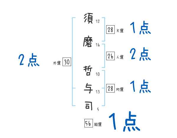 外運![]() | 須磨哲与司さんの外運は30画の2つ星!浮き沈みの激しさに注意しましょう。 生活面を象徴する運勢です。外部から受ける影響力を表し、結婚運、家庭運や職場、環境への順応性を表します。 |