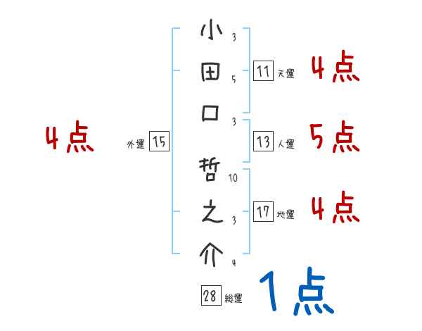 総運![]() | 小田口哲之介さんの総運は28画の1つ星!家庭環境に注意。スポーツで活躍できる能力があるかも。 あなたの人生を表す1番重要な運勢です。生涯を通じて影響する総合運となり、主に50歳以降の晩年期に影響を及ぼします。 |