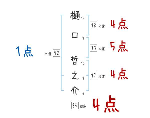 総運![]() | 樋口哲之介さんの総運は35画の4つ星!温厚な性格で感受性が高い。穏和な性格で人望が厚い。 あなたの人生を表す1番重要な運勢です。生涯を通じて影響する総合運となり、主に50歳以降の晩年期に影響を及ぼします。 |
