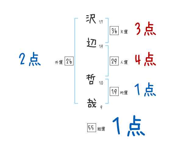 天運![]() | 沢辺哲哉さんの天運は36画の3つ星!先見性が豊かです。多少神経質で苦労することも。 家系が持つ宿命的な運勢を表します。祖先から受け継いだ苗字ですので自分の力が及びません。家柄を象徴します。 |