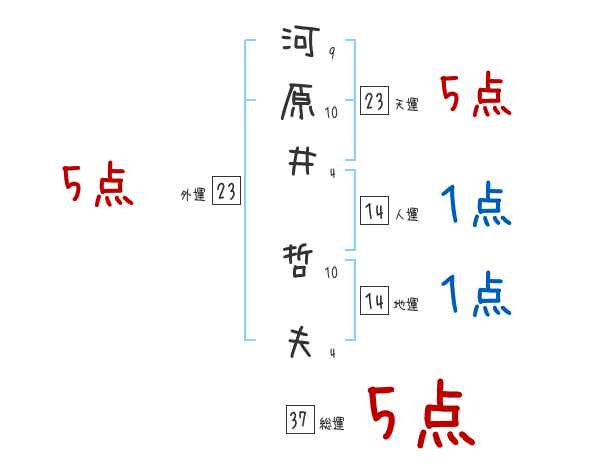 外運![]() | 河原井哲夫さんの外運は23画の5つ星!想像力に優れ活力がある。一代で成功し名誉を手に入れる。 生活面を象徴する運勢です。外部から受ける影響力を表し、結婚運、家庭運や職場、環境への順応性を表します。 |
