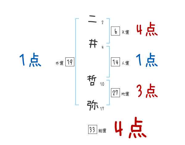 外運![]() | 二井哲弥さんの外運は19画の1つ星!優れた才能を持ちますが、協調性が足りないことも。周りの人と協力する事を意識しましょう。 生活面を象徴する運勢です。外部から受ける影響力を表し、結婚運、家庭運や職場、環境への順応性を表します。 |