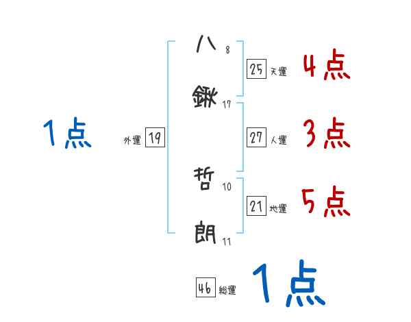 天運![]() | 八鍬哲朗さんの天運は25画の4つ星!個性があり才能があふれる。強運の持ち主で発展する。 家系が持つ宿命的な運勢を表します。祖先から受け継いだ苗字ですので自分の力が及びません。家柄を象徴します。 |