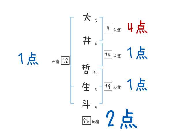 天運![]() | 大井哲生斗さんの天運は7画の4つ星!強い意志や信念を持ち独立心が強い。自立する。 家系が持つ宿命的な運勢を表します。祖先から受け継いだ苗字ですので自分の力が及びません。家柄を象徴します。 |