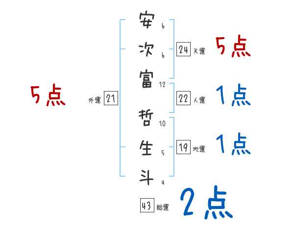 天運![]() | 安次富哲生斗さんの天運は24画の5つ星!家庭運が良く順調な人生。金運にも恵まれる。 家系が持つ宿命的な運勢を表します。祖先から受け継いだ苗字ですので自分の力が及びません。家柄を象徴します。 |