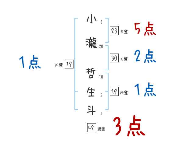 天運![]() | 小瀧哲生斗さんの天運は23画の5つ星!想像力に優れ活力がある。一代で成功し名誉を手に入れる。 家系が持つ宿命的な運勢を表します。祖先から受け継いだ苗字ですので自分の力が及びません。家柄を象徴します。 |