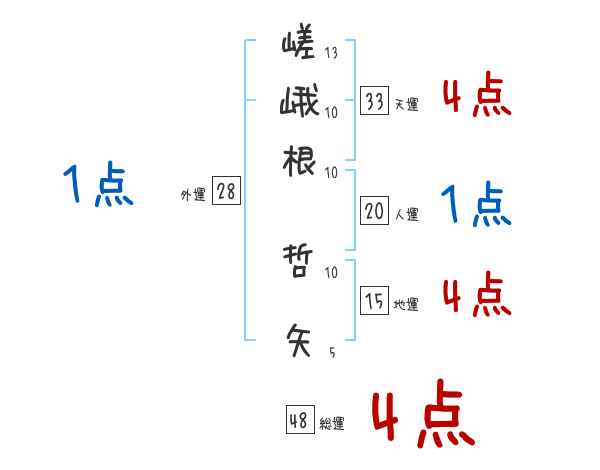 天運![]() | 嵯峨根哲矢さんの天運は33画の4つ星!権力志向でプライドが高い。勇気があり運を切り開き成功する。 家系が持つ宿命的な運勢を表します。祖先から受け継いだ苗字ですので自分の力が及びません。家柄を象徴します。 |